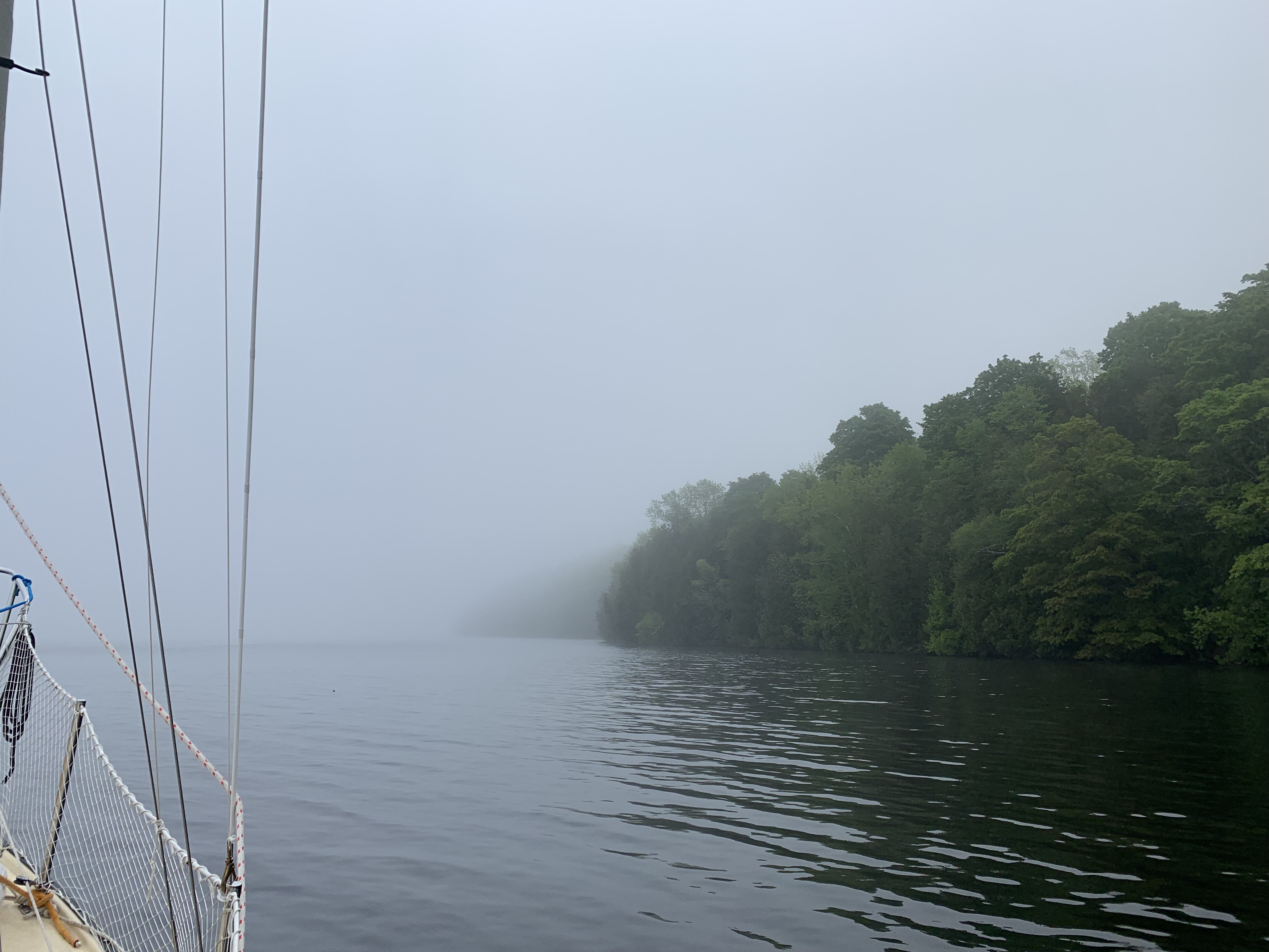 Thursday, May 30th: I awoke around 6 am in thick fog and little wind. I dared not leave the protection if my little cove in this thick soup. I spent the next couple hours cleaning and organizing the inside of my cabin. Around 8 am I could finally begin to see the shoreline some 200 feet away and I decided to embark.