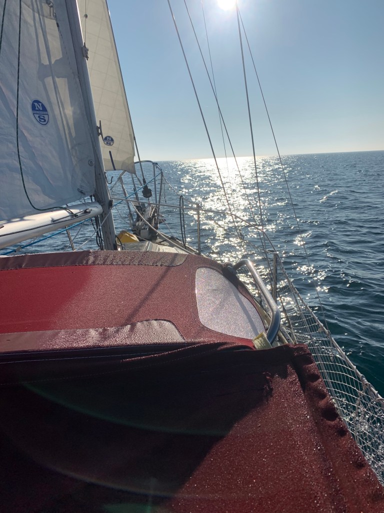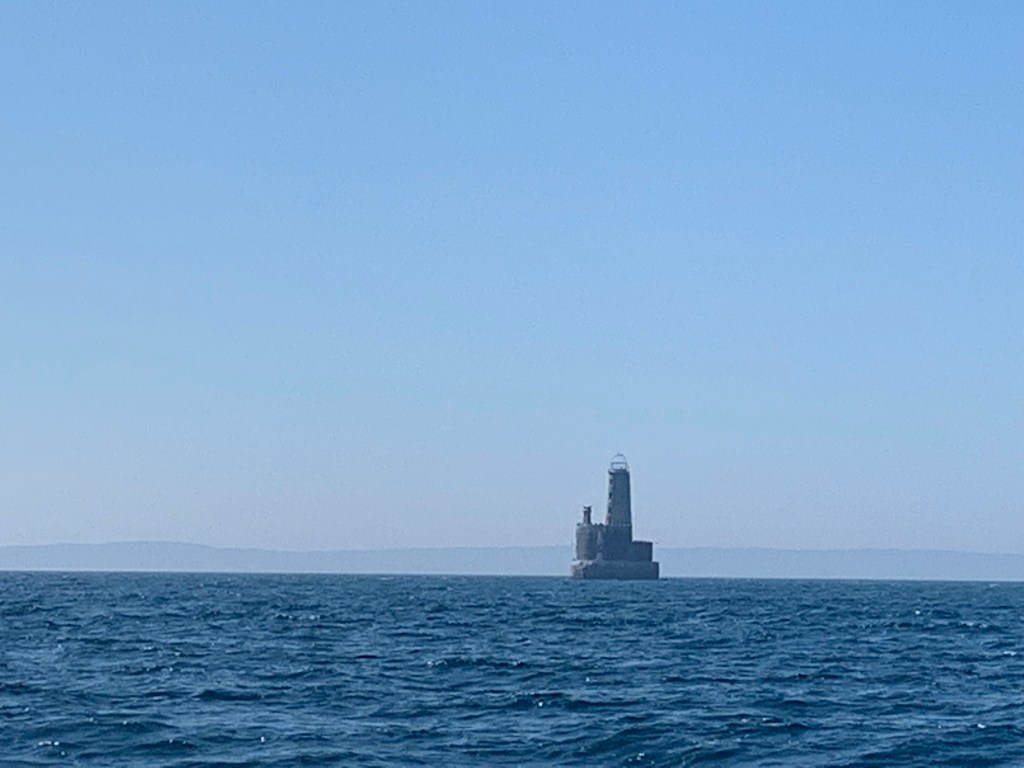 View of sunrise from Never Too Late prior to departing.Mental struggle as I force myself to leave Beaver Island and embark for St. Ignace.Underway in open waters. Good day to take advantage of the fair weather. Even after my extended rest on Beaver Island I have not recovered from this journeys’ toll. Fighting exhaustion. Need to focus and need to take advantage of the fair weather. I need to get to St. Ignace, then De Tour, then Sault Ste. Marie ! I’m running out of time.Never Too Late showing her journeys’ wear. Repaired anchor line.Passing the 125′ White Shoal Light on its northside.Heading east for St. Ignace under power as winds have died.Straits of Michigan completing Lake Michigan (3rd lake) circumnavigation.