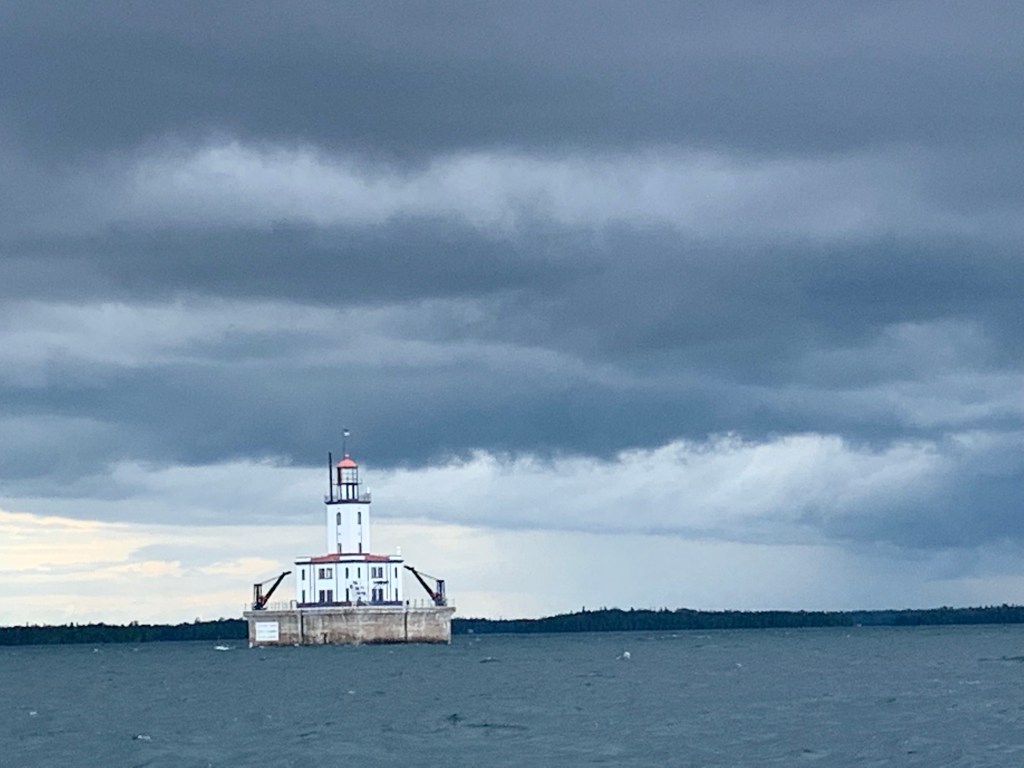 I was the last to leave my slip. It was a beautiful morning. The Canadian locks where scheduled to open at 8 am. I wasn’t the first to the lock but somehow I managed to be in first position of perhaps a dozen or so vessels secured to leave when the gates opened. Slowly we all rose as water filled to the level of Lake Superior. The Superior side lock doors finally opened and again I was the first vessel out and began heading for Gros Cap Light in Whitefish Bay, Lake Superior some twelve miles away. I remember smiling as I thought to myself, OK, I now have sailed my fifth Great Lake and I’m in first place. I won. I’m done. Now I can return to George Kemp Marina and get some sleep! Little did I know – deja vu!