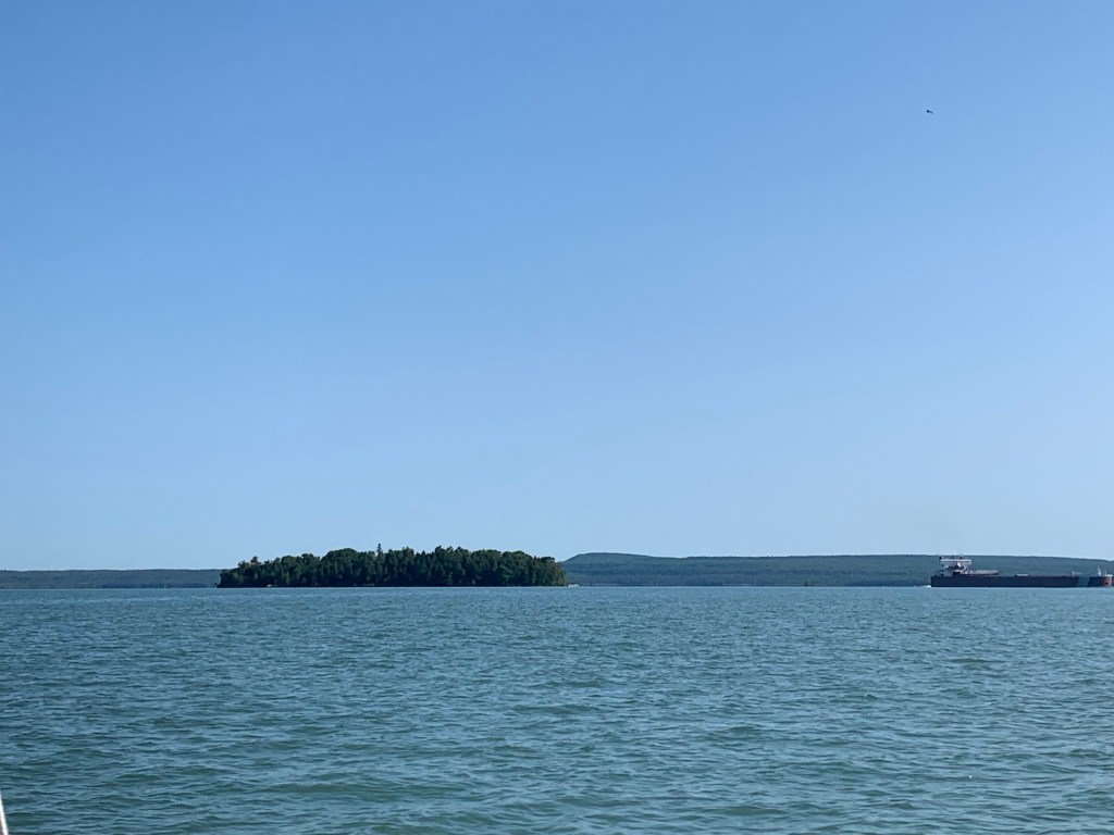 Not that there weren’t some exciting moments mind you. When I left this morning I headed straight north on the western shoreline. I wanted to avoid the deep freighter channel were the current was strongest so I set sail between the shoreline and west of an island. The freighter channel was between the east side of the island and the east shoreline of the St. Marys’ River. I had seen a freighter heading south towards me but figured it would follow the channel. Nope. Instead the freighter blew his horn went out of the channel and straight towards me. I quickly disengaged the auto-pilot and veered NTL briskly towards the shoreline. I was going to worry about my depth after I cleared. I quickly took a picture of passing culprit making its way on the west side of the island and west shoreline! I may have aimed my thoughts at her.