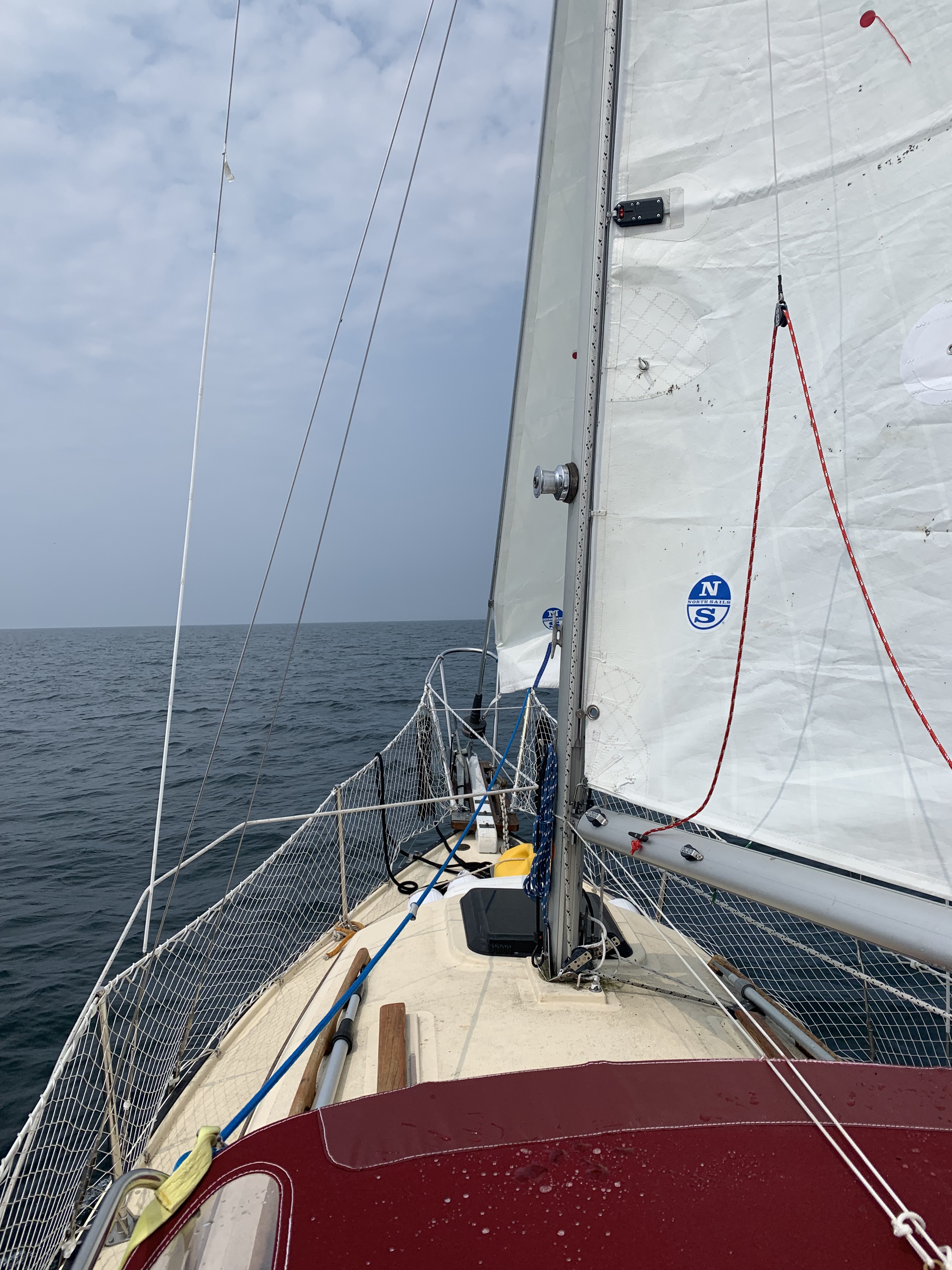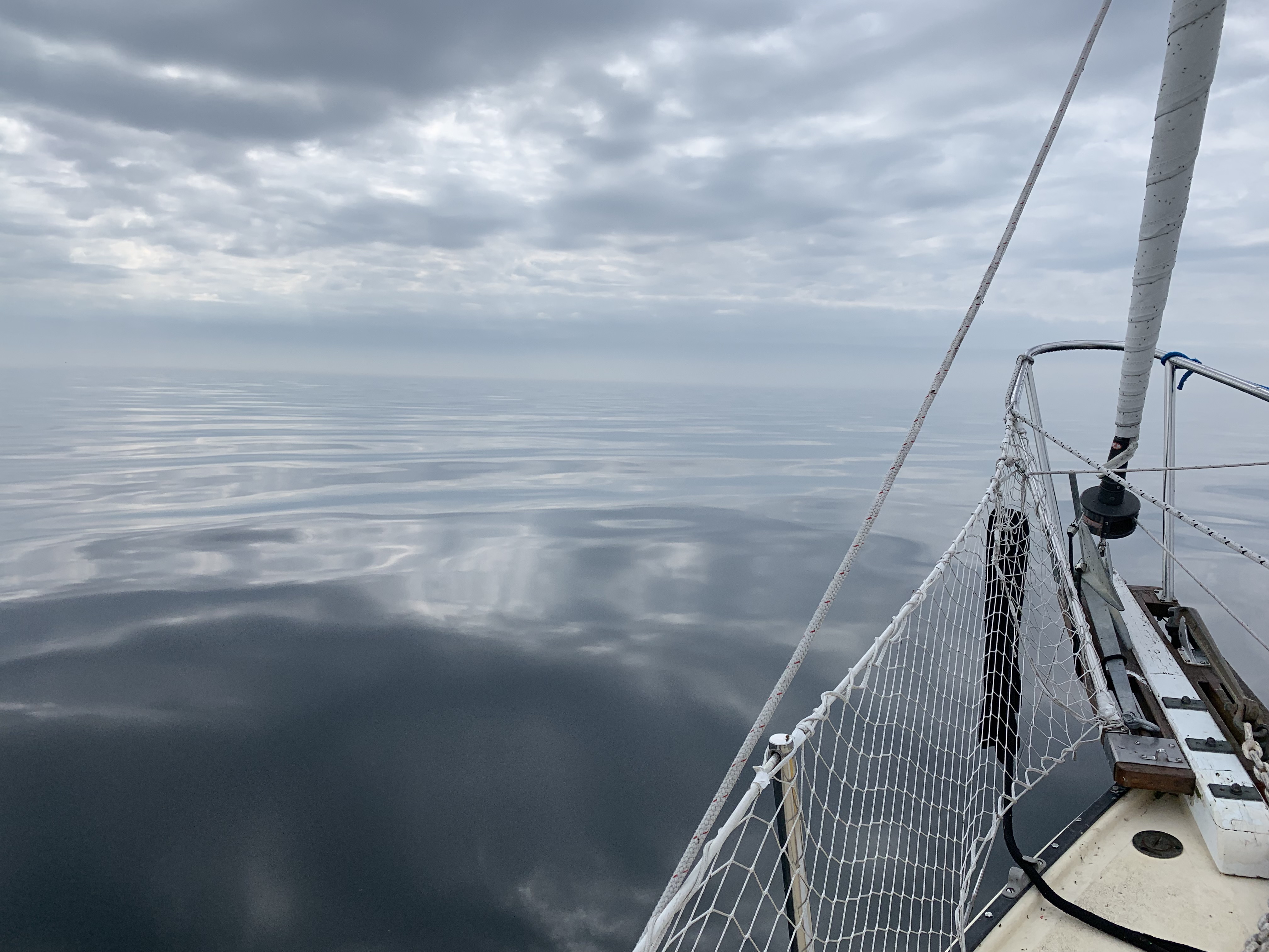 It was eerie the 30 miles in all glass waters and thick fog.  As I continued heading south across the lake at around 10 am (lake depth of  over 350′) I heard the sound of a ships’ horn to the west of me.   A familiar sound.  About ten minutes later, I can hear the ship sound its horn again coming from my left shoulder again from the west.  The fog was slowly lifting and I could begin to see about a couple of hundred yards.  I could now see the glass water surround NTL as she cut through with both sails and engine running.  I went to check my marine app but had no internet or telephone service in the middle of the lake.
