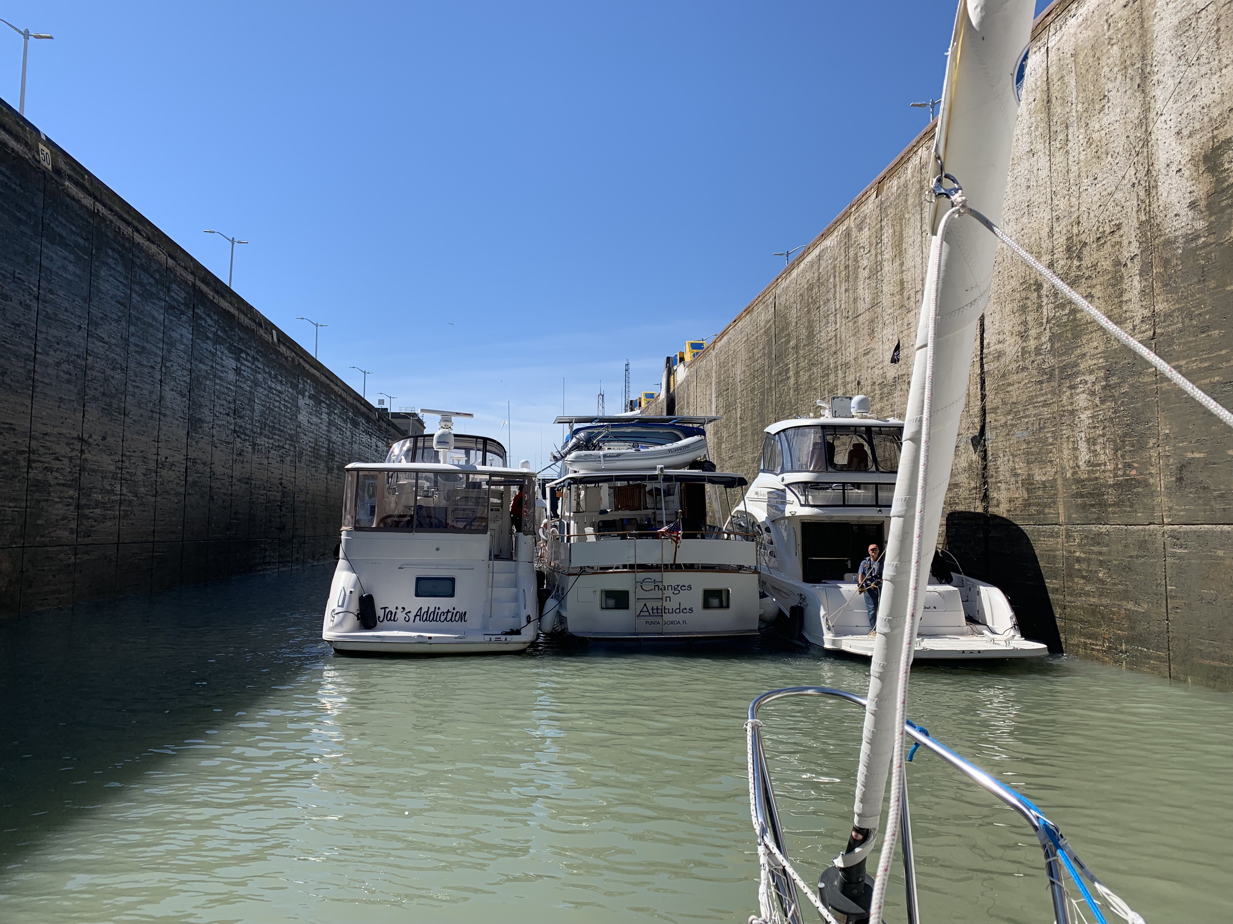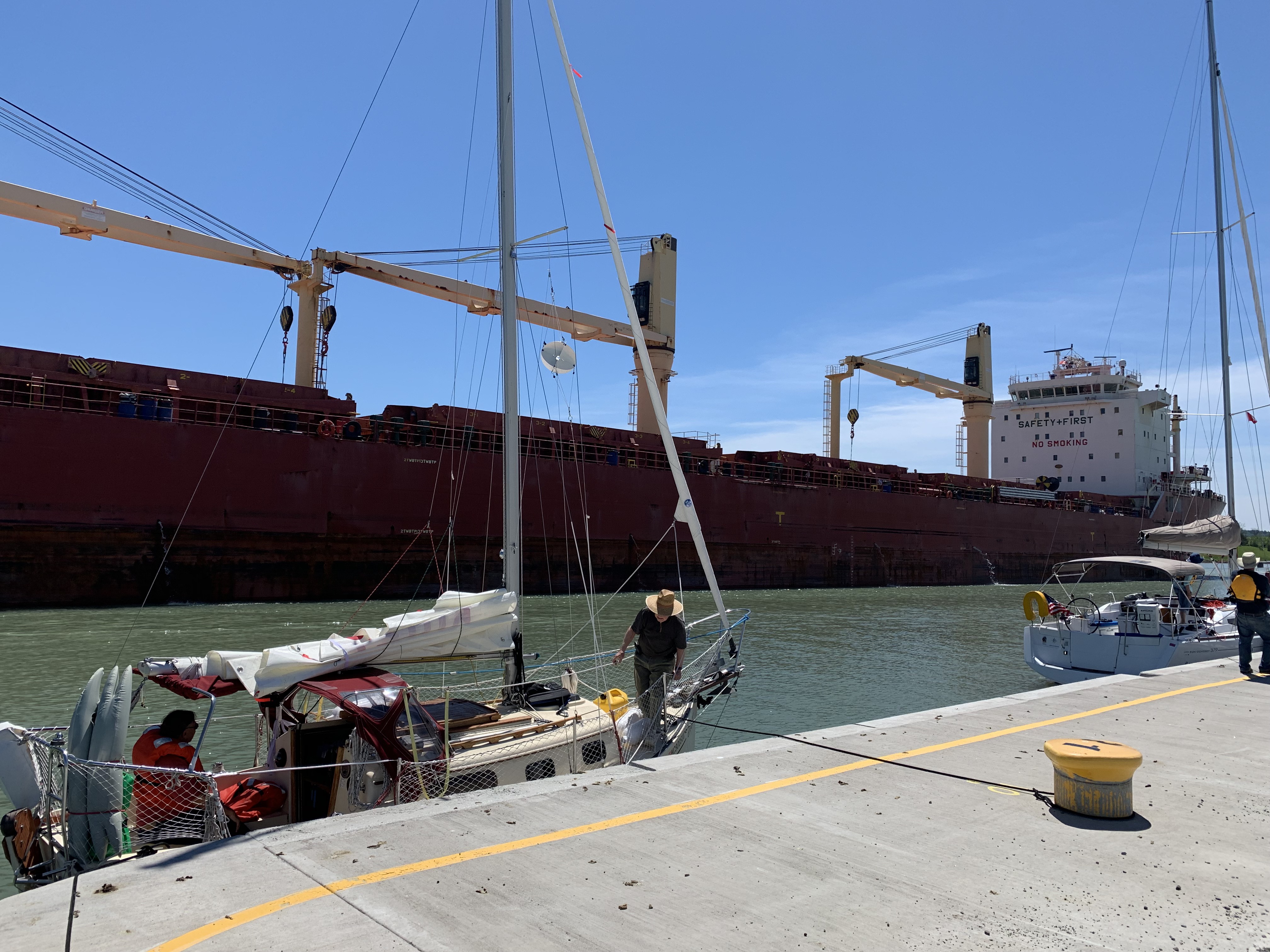 Saturday, June 8th:  We left Port Dalhousie around 6:30 am headed for Lock #1 at around 6:30 am.  I was told to be at the call-in station around 7:00 pm.  We arrived around 7:30 am and rafted next to a 37′ Beneteau that had just been purchased and headed back to Toledo.  There were 8 other boats already docked, waiting.  They were ‘small’ recreational boats ranging in size from the Beneteau (smallest) to a yacht well over 90 feet!  Clearly NTL was the class of the fleet.