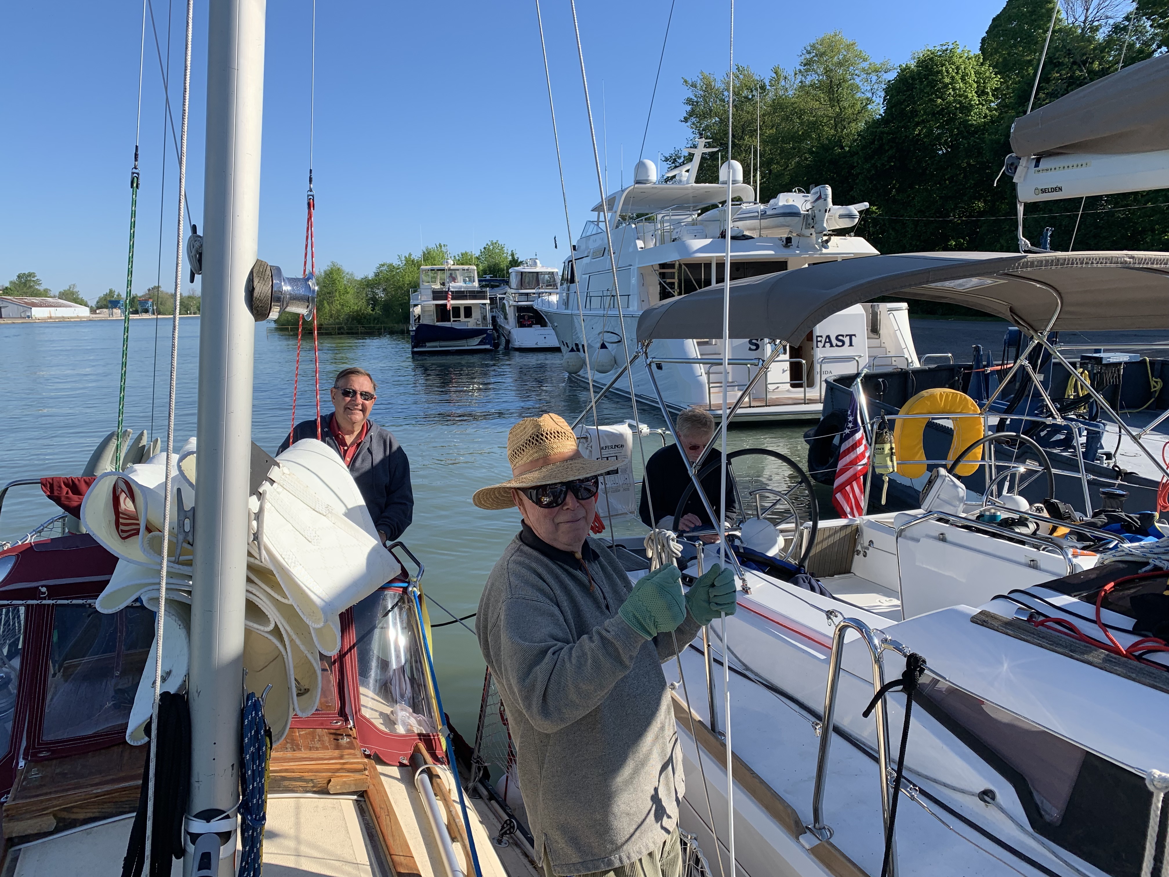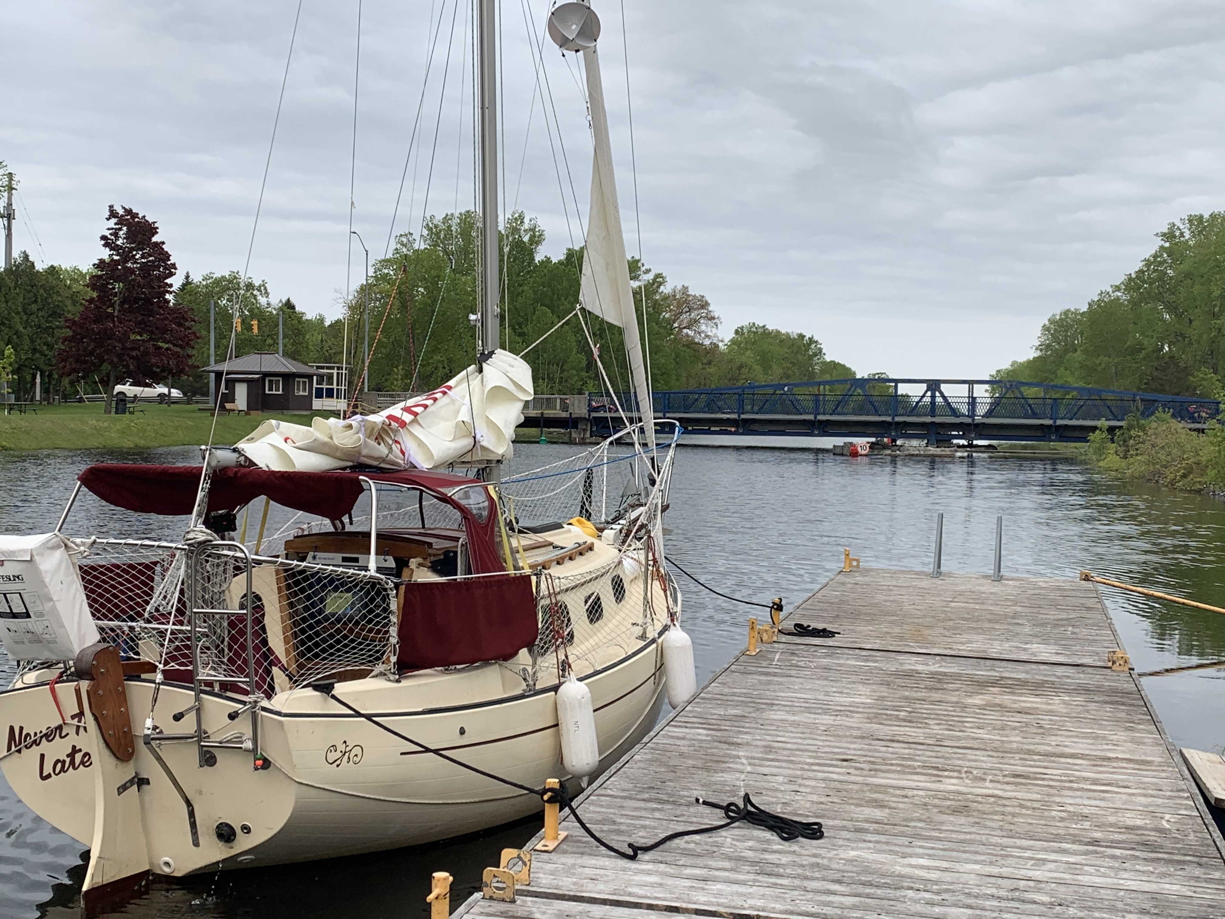 I arrived at Port Dalhousie mid-afternoon, secured a slip, took a needed shower so as not to empty the marina and worked on completing installation of my mainsail reefing system and outhaul.  Not completely happy with it but it is functional for now and until I figure out a better system.