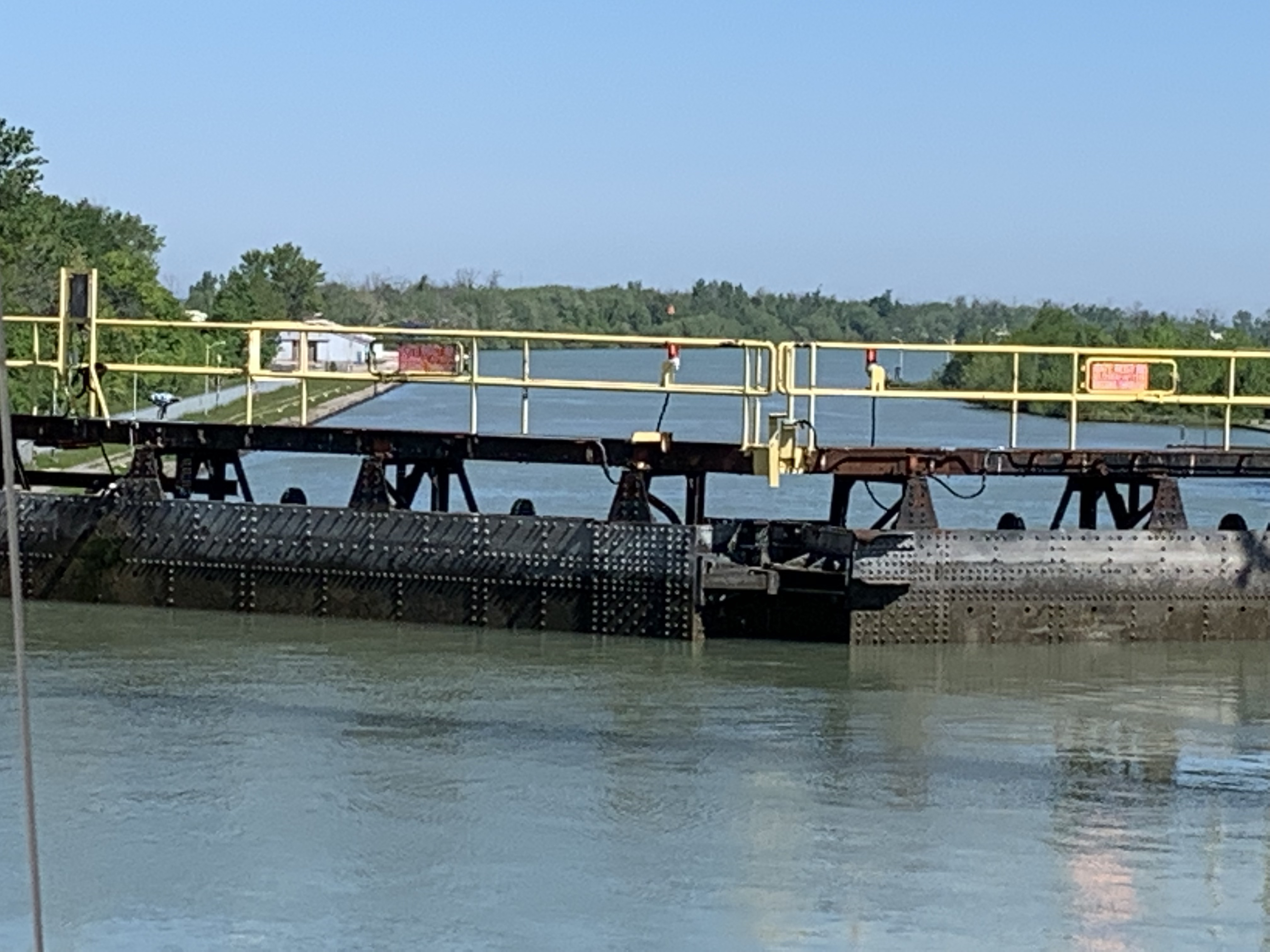 As I entered the Murray Canal, an older women was walking her dog.  She saw me and pointed and shouted “There’s a bridge”.  I looked ahead and sure enough I could see a road bridge about a mile ahead.  I asked her what’s the number to call to have it opened.  She responded with something that wasn’t discernable.  She then pointed to herself and began jogging towards the bridge!  I presumed she was the bridge attendant and offered to have her come aboard.  She smiled, waved me off and shouted ” Tie-up at the dock by the bridge.”  I proceeded slowly the mile and did as instructed.  I soon saw her on the other side of the canal jogging past the bridge and never saw her again!  I thought about walking off the dock to the bridge house but the water level was well above the dock ramp.